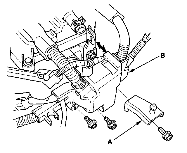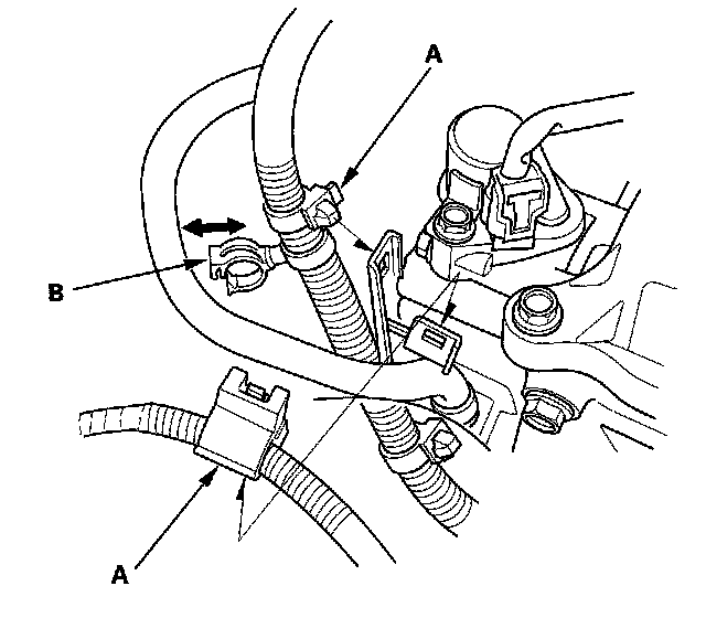 7. Remove the harness clamps (A), and remove the positive crankcase ventilation (PCV) hose from the clamp (B).