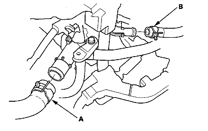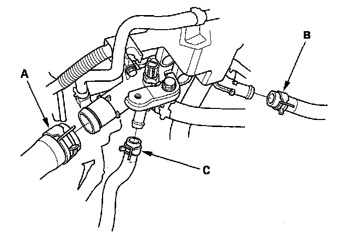 10. A/T model: Remove the upper radiator hose (A), heater hose (B), and water bypass hose (C).