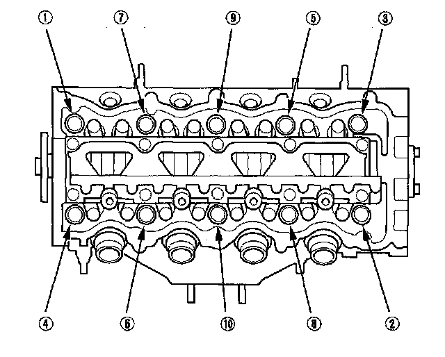 16. Remove the cylinder head bolts. To prevent warpage, unscrew the bolts, in sequence, 1/3 of a turn at a time; repeat the sequence until all bolts are loosened.