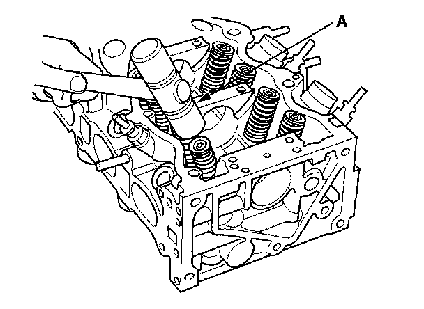 8. Lightly tap the end of each valve stem two or three times with a plastic mallet (A) to ensure proper seating of the valve and valve cotters. Tap the valve stem only along its axis so you do not bend the stem.