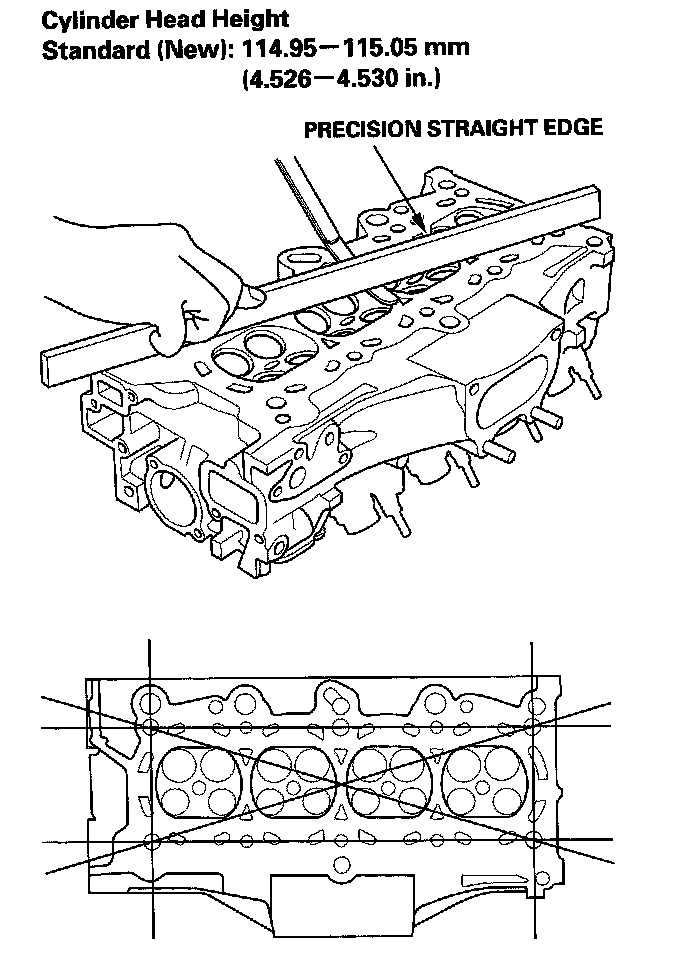 3. Check the cylinder head for warpage. Measure along the edges, and three ways across the center.