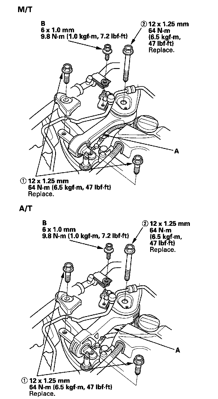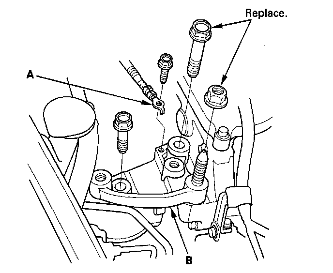 2. Remove the bolt (A) securing the A/C line, then remove the upper torque rod (B).