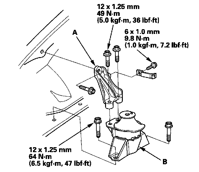 4. Remove the side engine mount stiffener (A), then remove the side engine mount (B).