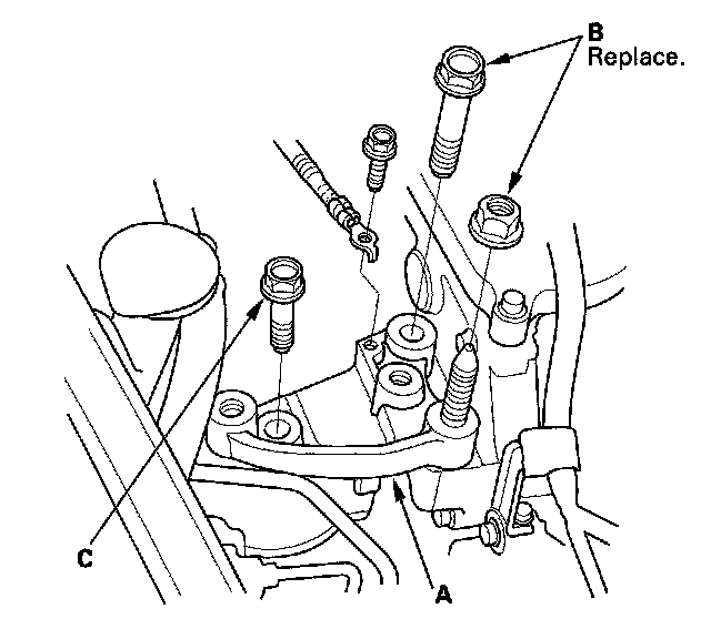 6. Install the side engine mount bracket (A), then loosely tighten the new bolt and nut (B). Loosely tighten the bolt (C).