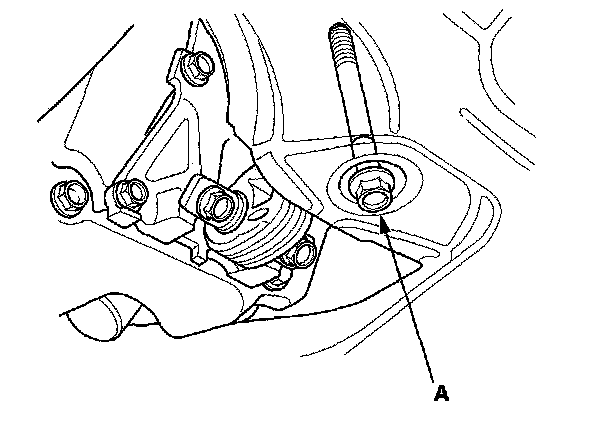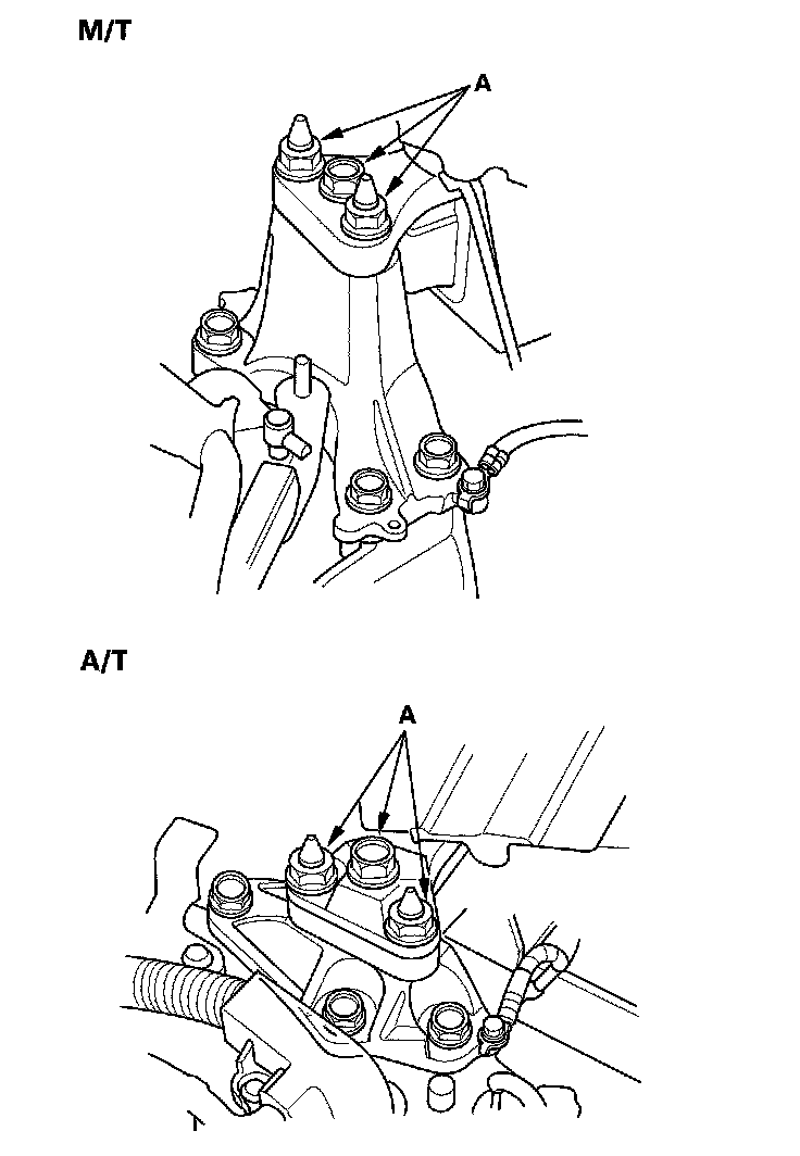 9. Loosen the transmission mounting bolt and nuts (A).