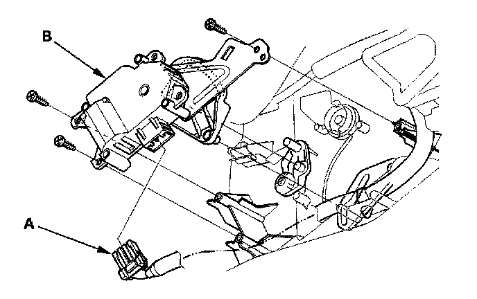 2. Disconnect the 7P connector (A) from the air mix control motor (B). Remove the self-tapping screws and the air mix control motor from the heater unit.