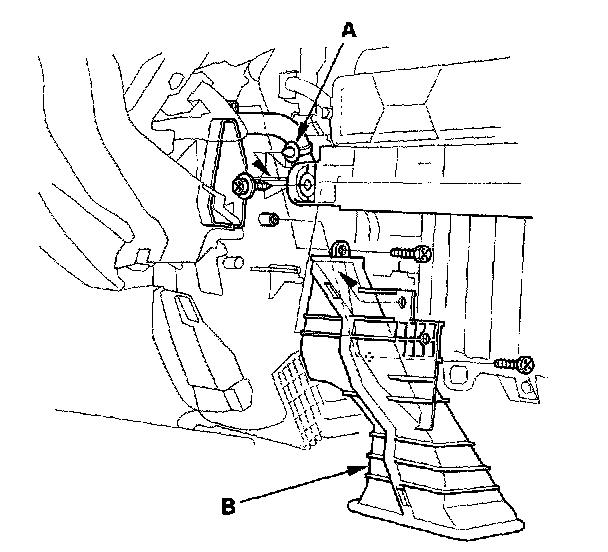 2. Remove the wire harness clip (A), the self-tapping screws, and the passenger's heater duct (B).