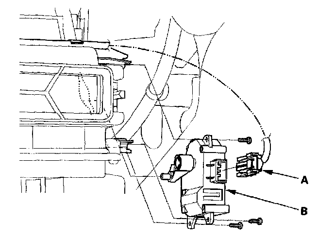 2. Disconnect the 7P connector (A) from the recirculation control motor (B). Remove the self-tapping screws and the recirculation control motor from the blower unit.