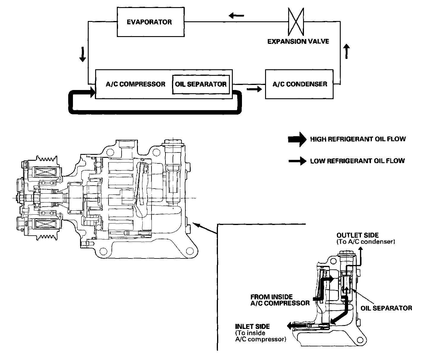 Oil emission from the A/C compressor to the A/C line is reduced by placing the oil separator in the A/C compressor. This results in a thinner oil film inside of the heat exchanger (A/C condenser and evaporator). Air conditioning efficiency is increased without sacrificing engine performance.