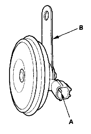 3. Test the horn by connecting battery power to the terminal (A) and grounding the bracket (B), The horn should sound.
