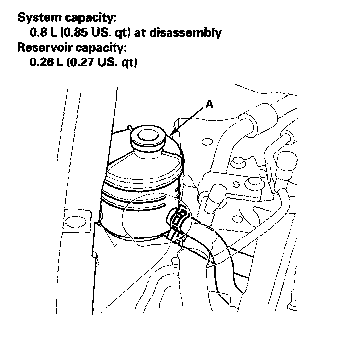 Fluid ReplacementCheck the reservoir (A) at regular intervals, and add the recommended fluid as necessary. Always use Honda Power Steering Fluid. Using any other type of power steering fluid or automatic transmission fluid can cause increased wear and poor steering in cold weather.