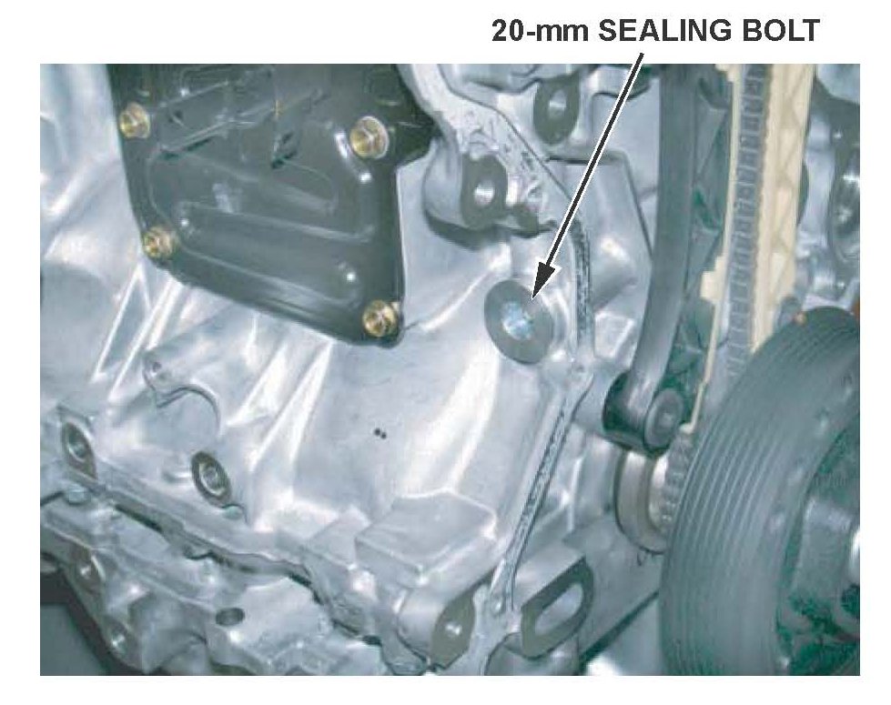 ^ Oil leaks from the 20-mm sealing bolt tend to collect on the lower engine block and oil pan.