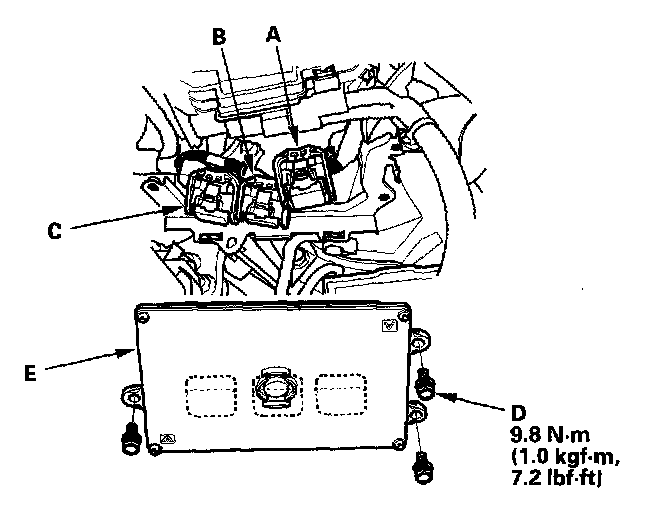 9. Remove the bolts (D), then remove the ECM/PCM (E).