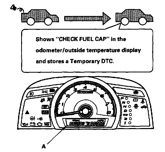 During the first drive cycle after a cold start, the ECM/PCM alerts the driver to check the fuel fill cap by showing a "CHECK FUEL CAP" message in the odometer/outside temperature display (A), and it stores Temporary DTC P0457 "Evaporative Emission (EVAP) System Leak Detected/Fuel Fill Cap Loose or Missing". Tightening the fuel cap does not make the message go off immediately.