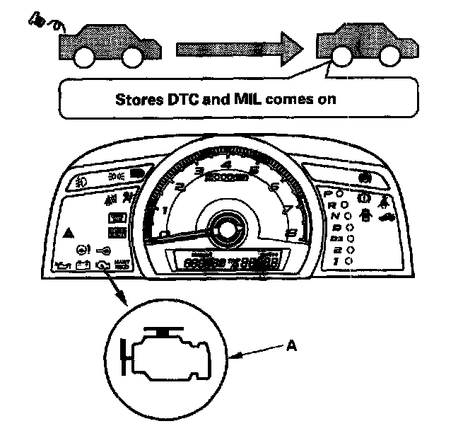 During the third drive cycle after a cold start, if the fuel fill cap is still loose or missing, the ECM/PCM stores DTC P0457 "Evaporative Emission (EVAP) System Leak Detected/Fuel Fill Cap Loose or Missing". The malfunction indicator lamp (MIL) (A) comes on, and the "CHECK FUEL CAP" message goes off.