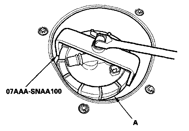 4. Using the tool, tighten the fuel tank unit locknut (A).