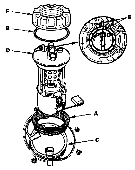2. Insert the fuel tank unit (D) into the fuel tank. Be careful not to bend the fuel gauge sending unit.