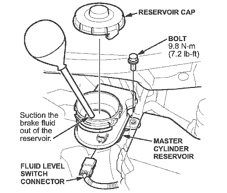 8. Remove the brake fluid from the master cylinder reservoir with a syringe.