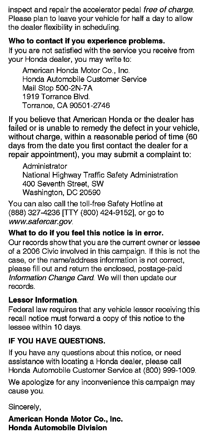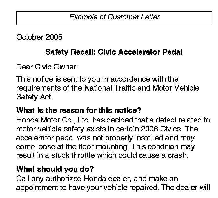Safety Recall: 2006 Civic Accelerator Pedal Inspection
