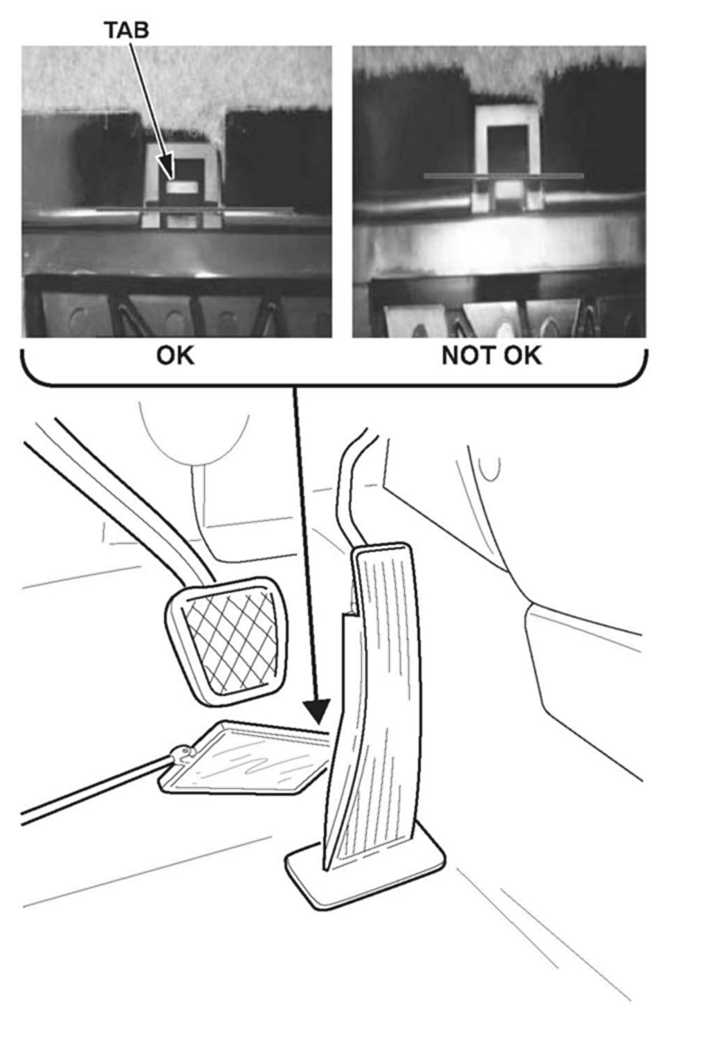 ^ Check that the carpet backing is not trapped between the accelerator pedal and the base of the stop.