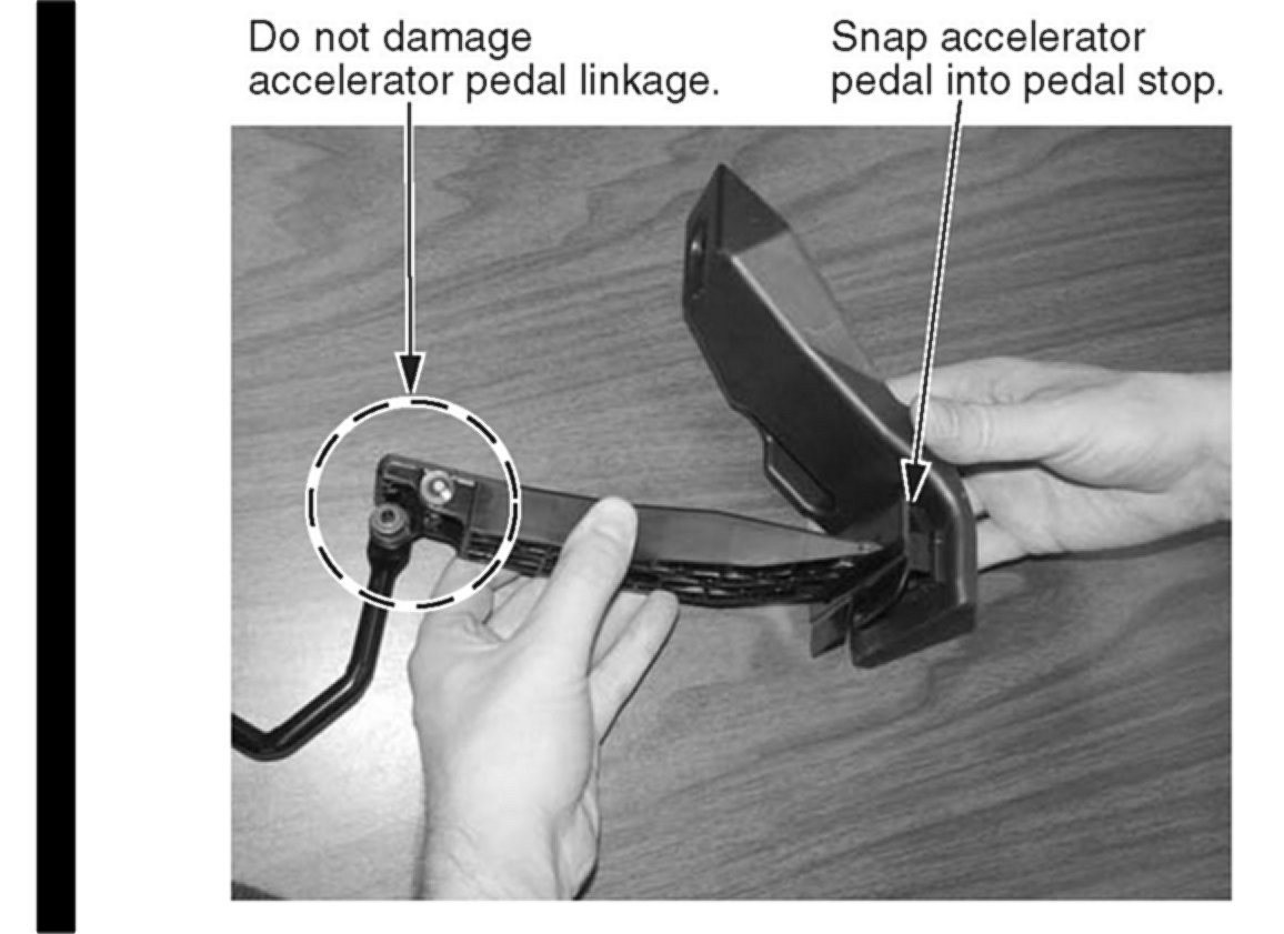 2. If the accelerator pedal separates from the base of the stop, snap the pedal back into place and repeat step 1.