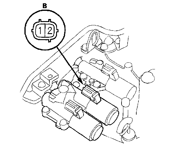 12. Connect a jumper wire from the negative battery terminal to A/T clutch pressure control solenoid valve B connector terminal No. 2, and connect another jumper wire from the positive battery terminal to the connector terminal No. 1. Make sure the A/T clutch pressure control solenoid valve B moves.