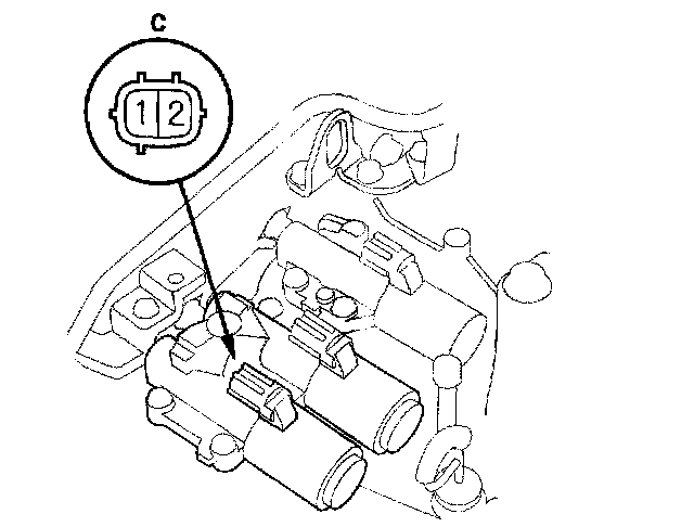 8. Connect a jumper wire from the negative battery terminal to the solenoid valve C connector terminal No. 2, and connect another jumper wire from the positive battery terminal to the connector terminal No. 1.