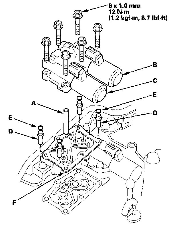 10. Remove the ATF pipe (A), ATF joint pipes (D), O-rings (E), and gasket (F).