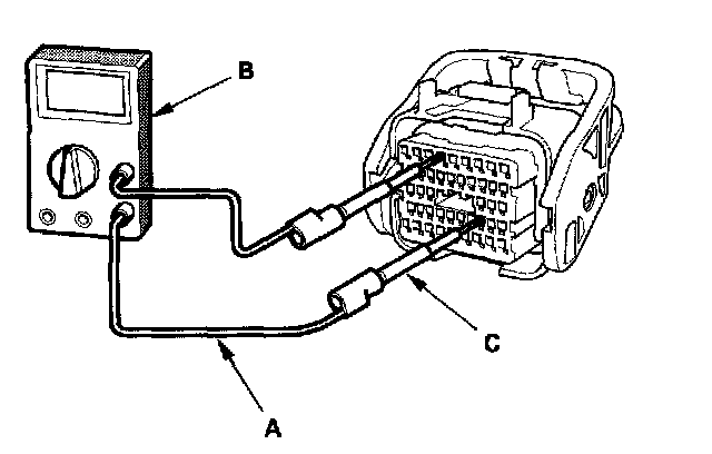 5. Connect one side of the patch cord (A) terminal to a digital multimeter (B), and connect the other side of the patch cord terminals to a commercially available banana jack (Pomona Electronics Tool No. 3563 or equivalent) (C).