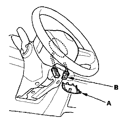4. Remove the access panel (A) from the steering wheel then disconnect the driver's airbag 4P connector (B) from the cable reel.