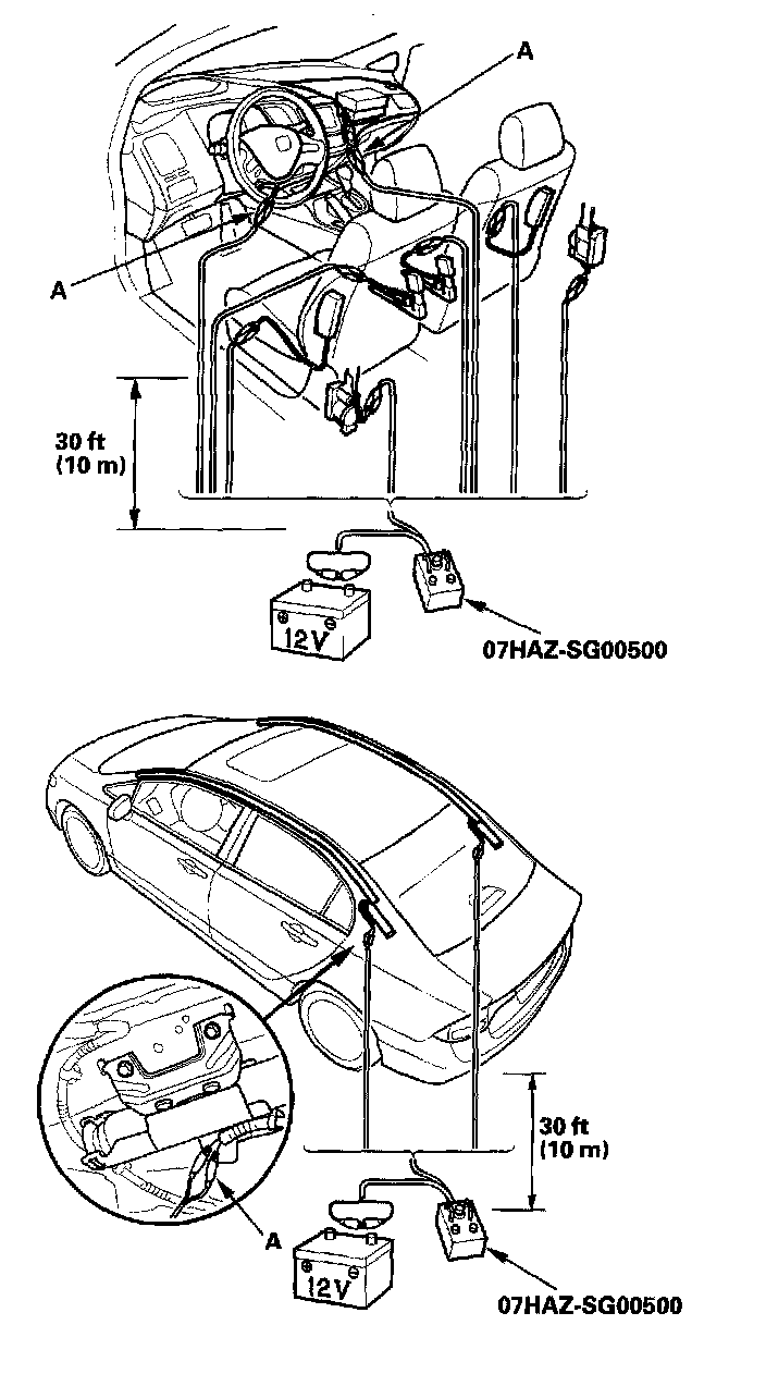10. Cutoff each connector, and strip the ends of the wires. Twist each pair of unlike colored wires together, and clip an alligator clip (A) from the deployment tool to each pair. Place the deployment tool at least 30 feet (10 meter) away from the vehicle.