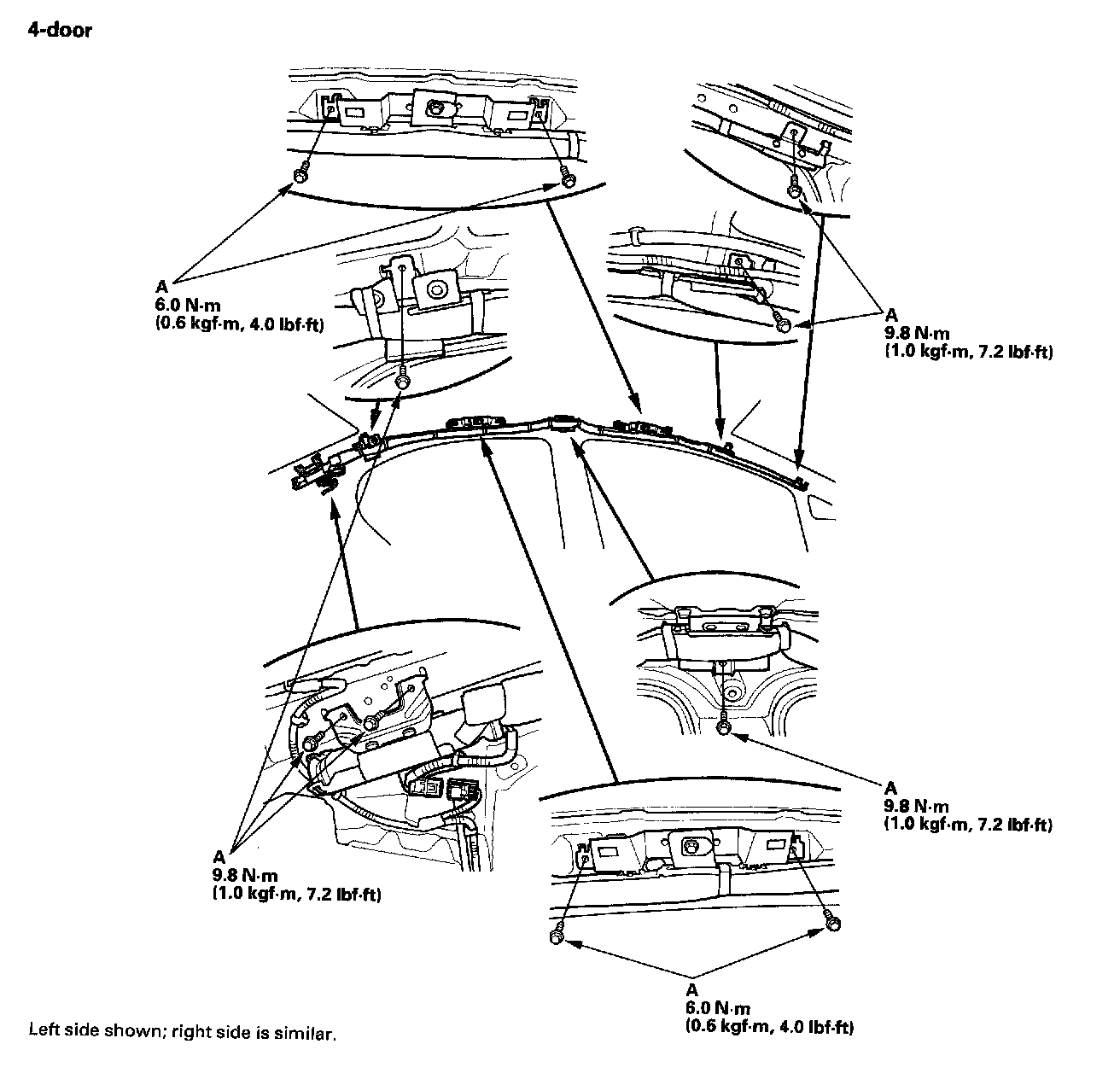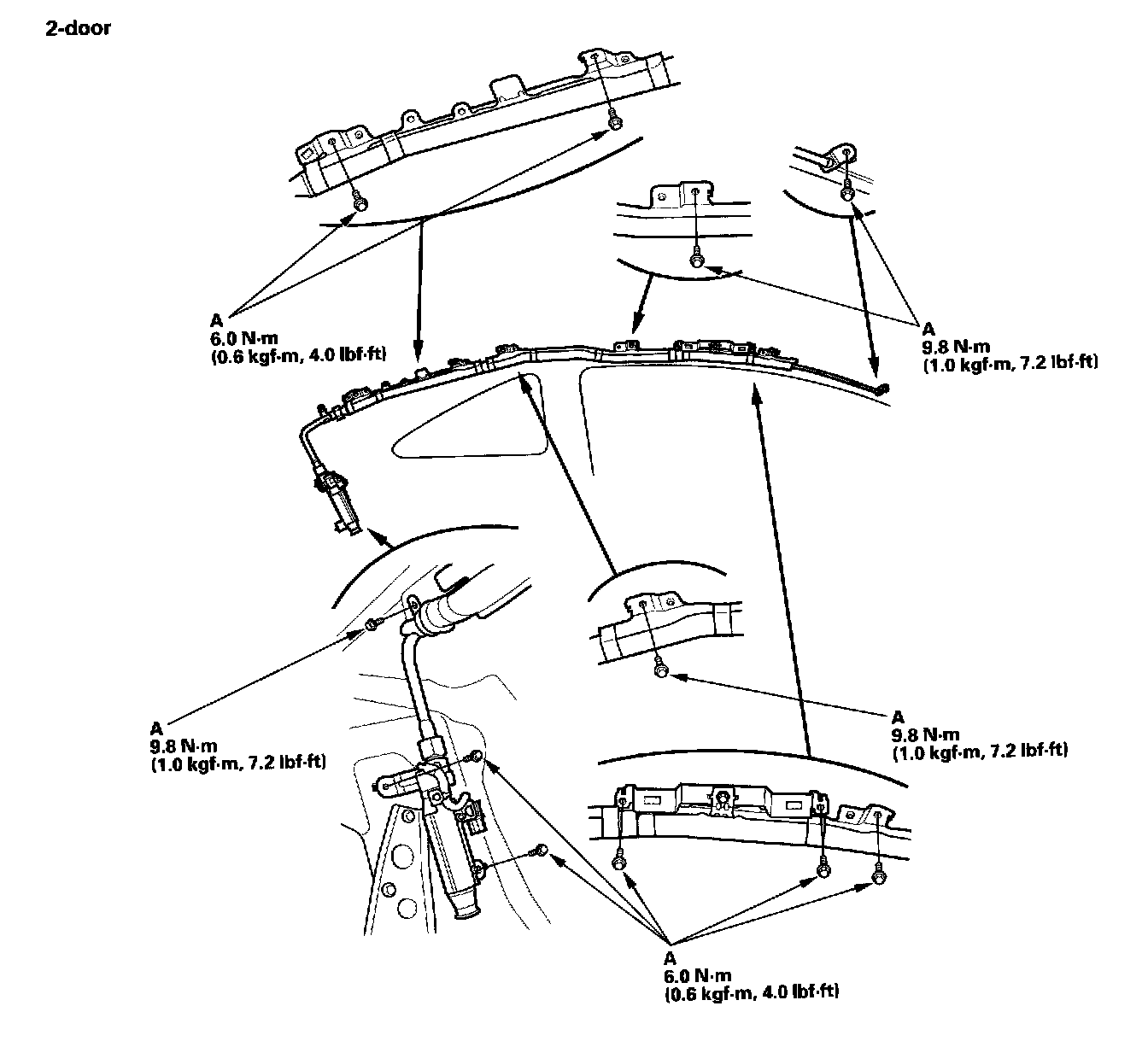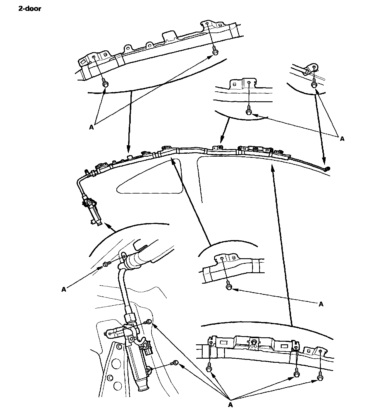 1. Place the new side curtain airbag assembly on the side of the roof. Tighten the side curtain airbag mounting bolts (A).