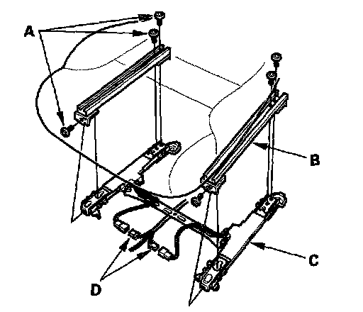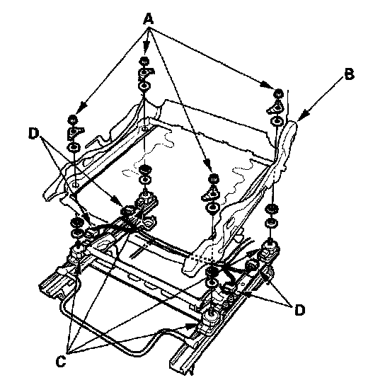 5. Disconnect the sensor connectors (D) from the seat weight sensor, then remove the front passenger's weight sensors.
