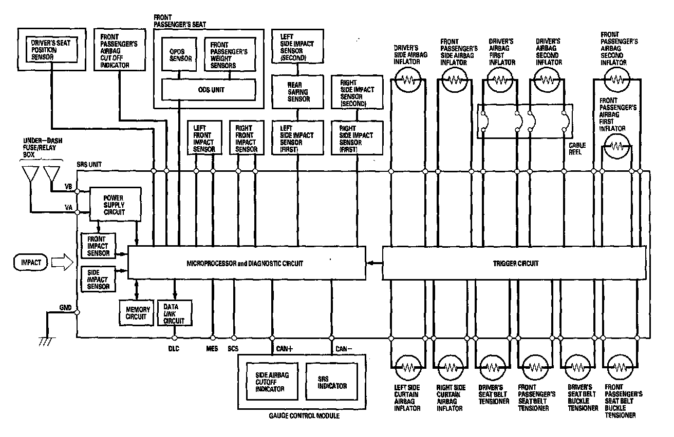 The main circuit in the SRS unit senses and judges the force of impact and, if necessary, ignites the inflator charges. If battery voltage is too low or power is disconnected due to the impact, the voltage regulator and the back-up power circuit will keep voltage at a constant level.