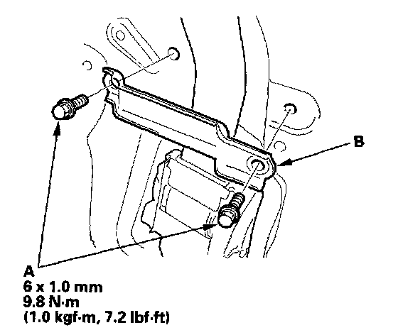 6. Remove the bolts (A) and the seat belt guide (B).