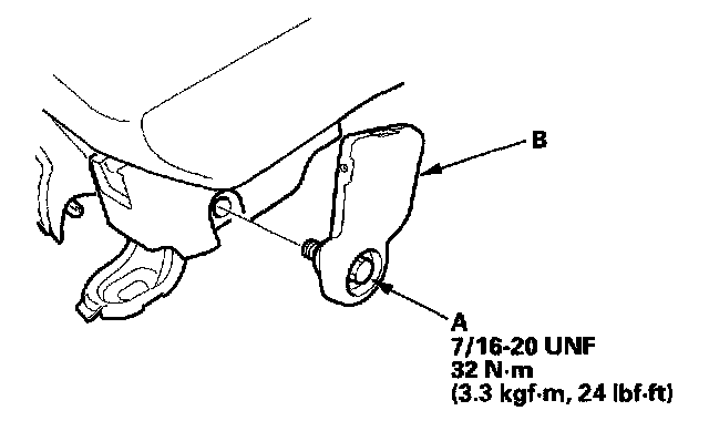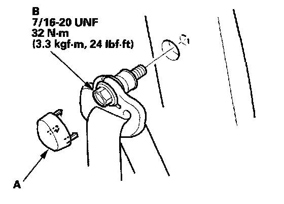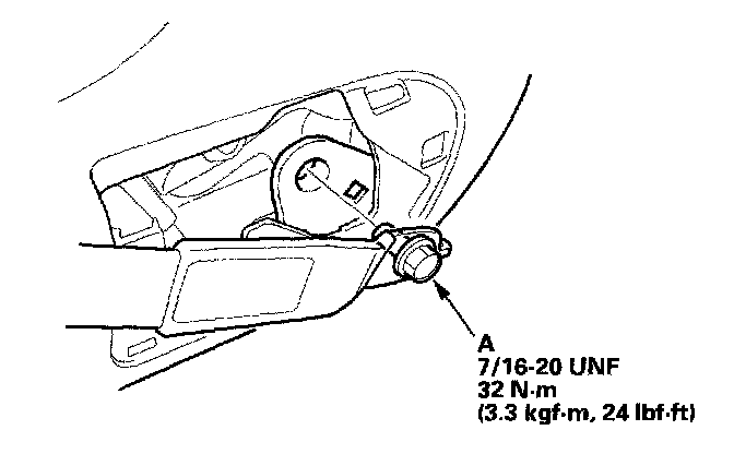 - Driver's seat belt: Remove the lower anchor cap (A), and remove the lower anchor bolt (B).