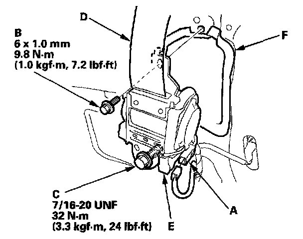 Unlock the lower anchor by pushing in on the screwdriver. Remove the screwdriver, and then detach the front seat belt anchor plate (F) and anchor cover from the lower anchor.