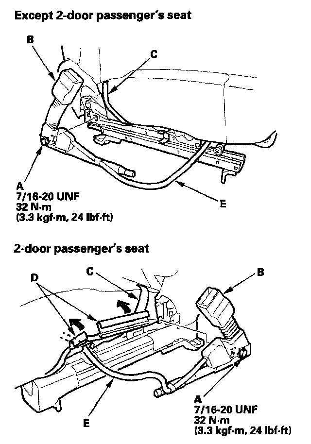 8. Disconnect the seat belt tensioner connector (A). Remove the upper retractor mounting bolt (B) and the lower retractor bolt (C), then remove the front seat belt (D) and retractor (E).