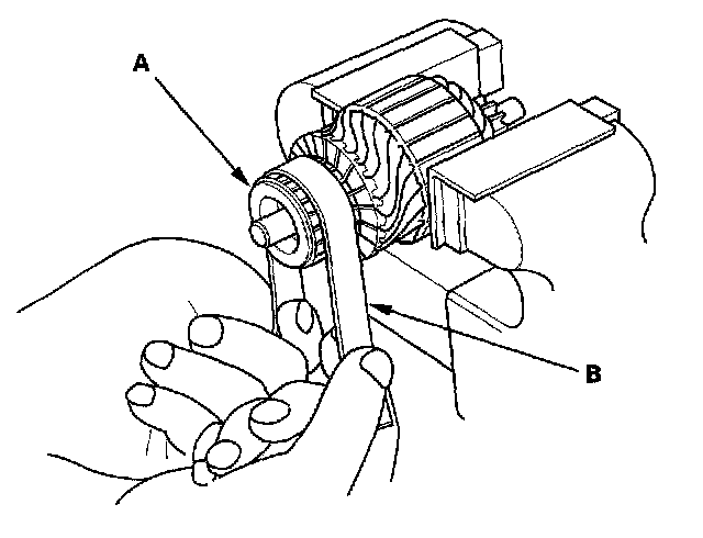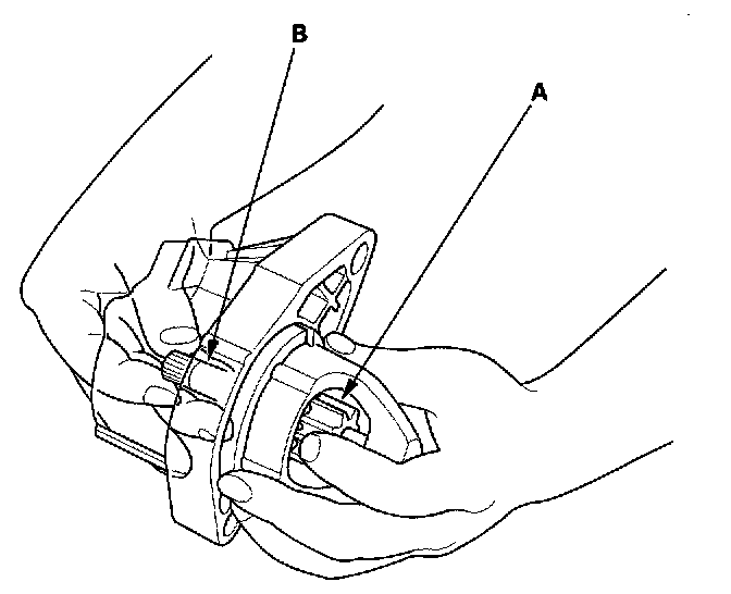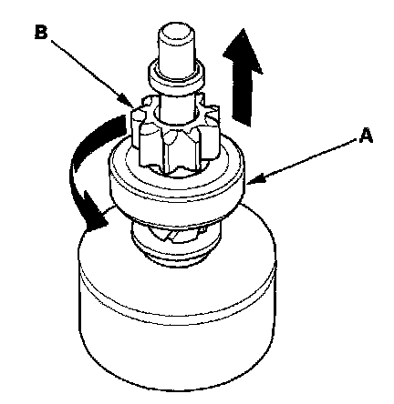 17. Hold the drive gear (B), and turn the overrunning clutch in the direction shown to make sure it turns freely. Also make sure the overrunning clutch locks in the opposite direction.