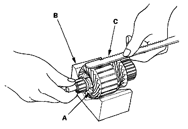 9. Place the armature (A) on an armature tester (B). Hold a hacksaw blade (C) on the armature core. If the blade is attracted to the core or vibrates while the core is turned, the armature is shorted. Replace the armature.
