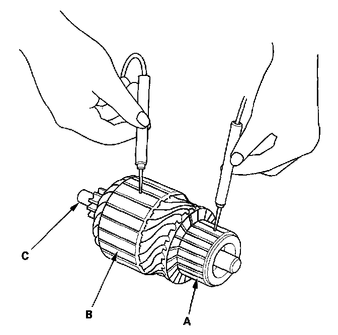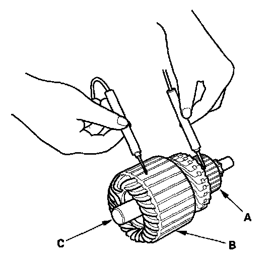 10. Check with an ohmmeter for continuity between the commutator (A) and armature coil core (B), and between the commutator and armature shaft (C). If there is continuity, replace the armature.