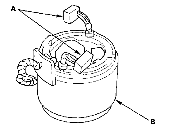 13. Check for continuity between each brush (A) and the armature housing (B). If there is continuity, replace the armature housing.