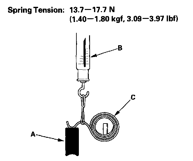 15. Insert the brush (A) into the brush holder, and bring the brush into contact with the commutator, then attach a spring scale (B) to the spring (C). Measure the spring tension at the moment the spring lifts off the brush.