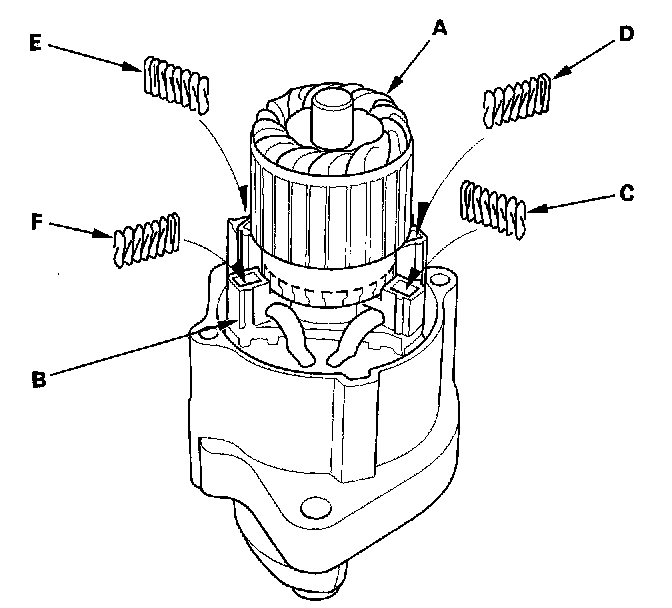 18. While squeezing a spring (C), insert it in the hole on the brush holder, and push it until it bottoms. Repeat this for the other three springs (D, E, and F).
