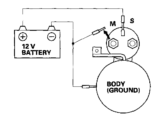 3. Connect the battery as shown. Make sure you disconnect the starter motor wire from the solenoid. If the starter pinion moves out, it is working properly.