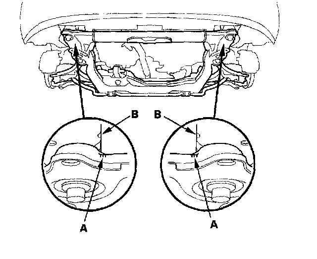 8. Align the front subframe reference marks (A) to the body (B), as noted during removal.
