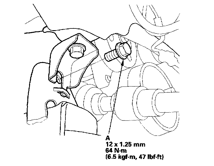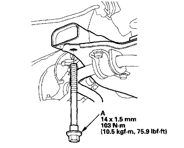 13. Install the front subframe middle mount bolt (A) on the right side, and tighten it to the specified torque.