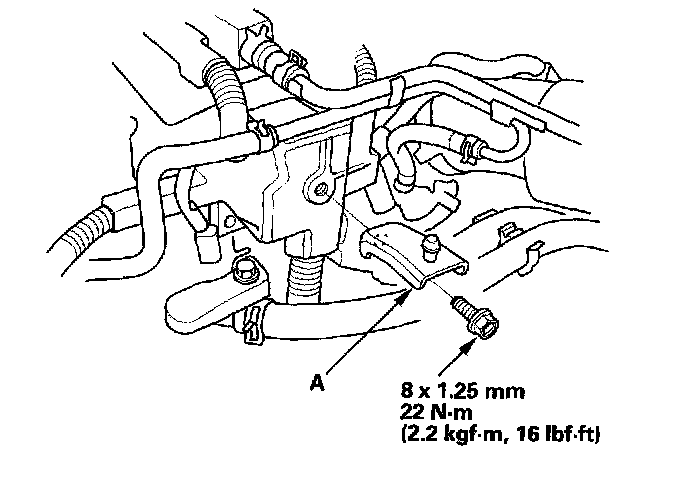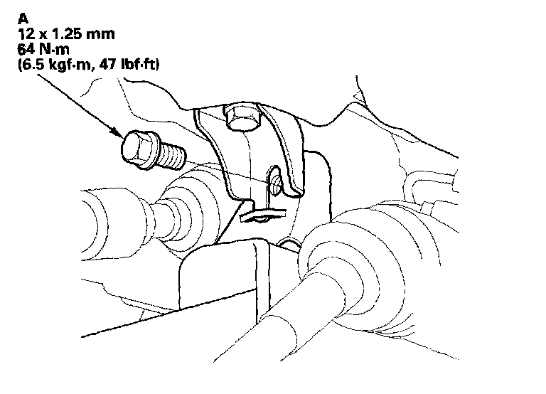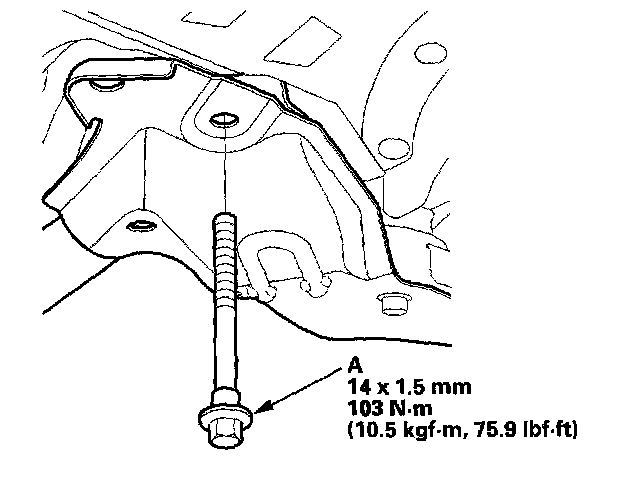 12. Install the front subframe middle mount bolt (A) on the left side, and tighten it to the specified torque.