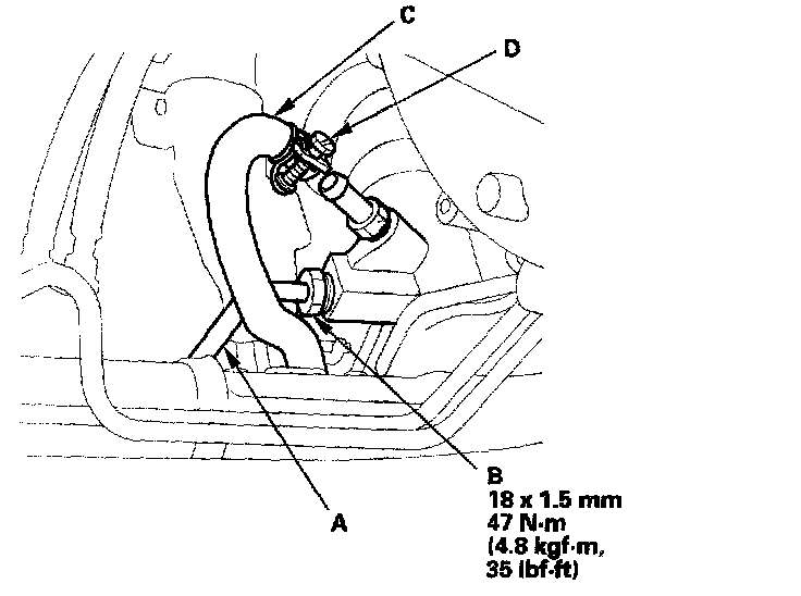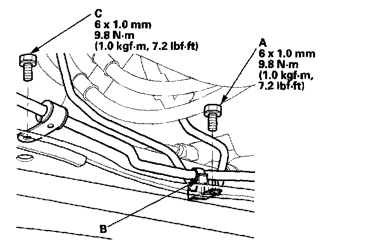 18. Install the inlet line clamp bolt (A). Install the return line holder (B), and the return line clamp bolt (C) on the front subframe.