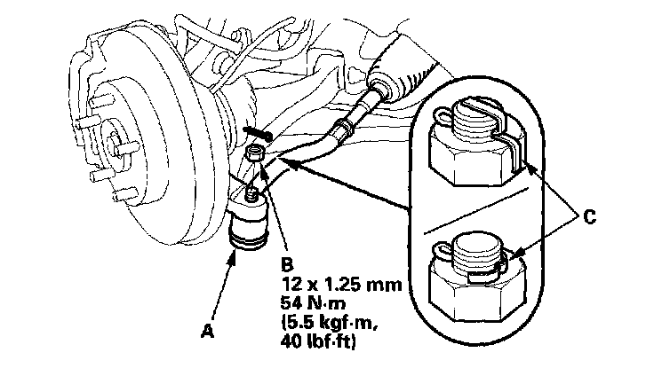 22. Wipe off any grease contamination from the ball joint tapered section and threads. Reconnect the tie-rod ends (A) to the steering knuckles. Install the 12 mm nut (B), and tighten it.